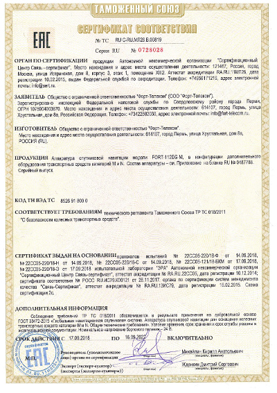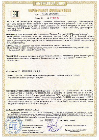 АСН, устанавливаемая на транспортные средства начиная с 01.09.2021, должна соответствовать требованиям технического регламента Таможенного союза «О безопасности колесных транспортных средств» (ТРТС 018/2011) и быть сертифицирована.